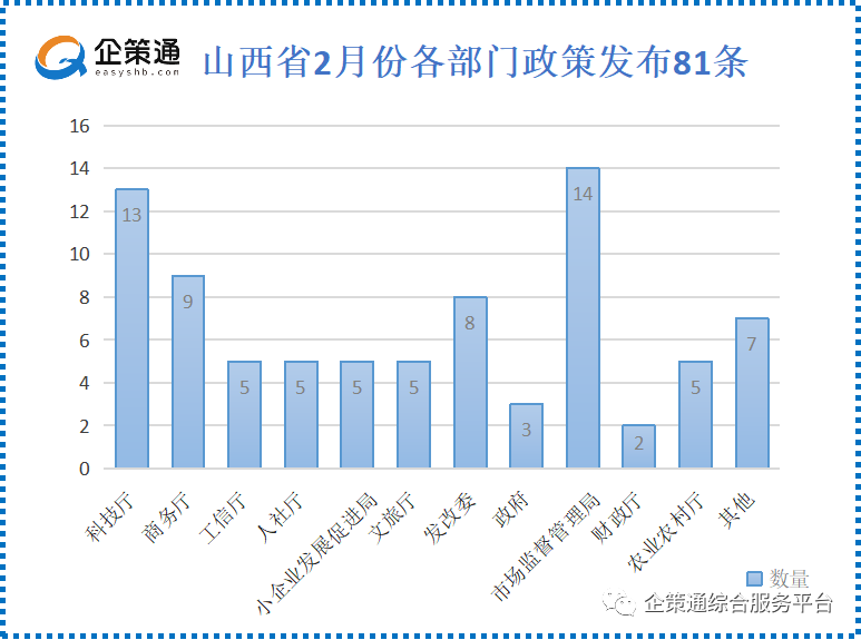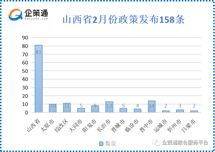 1. 数量:本月山西省共发布政策158条,其中山西省省级政策发布81条,太原市发布10条,综改区发布11条,其余各地市发布56条。省级政策中科技厅、市场监督管理局及商务厅本月发布政策数量最多。