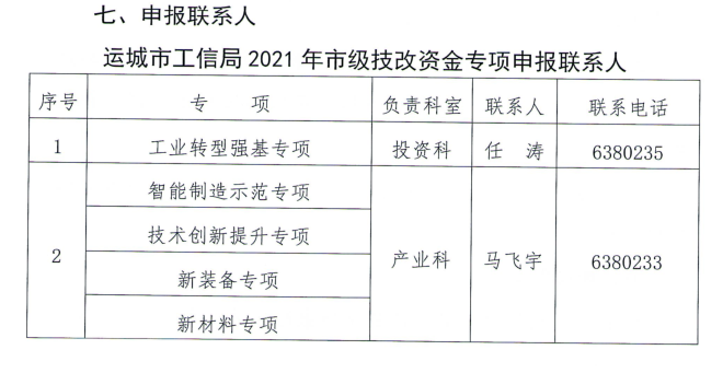 为贯彻落实市“两会”和全市招商引资暨项目建设大会精神,进一步聚焦“六新”突破,做强做大十大工业主导产业集群和打造“合(和)汽(气)生材(财)”新兴产业地标,为“十四五”全市工业开好局、建设“新兴产业强市”提供项目支撑,依据《运城市技术改造专项资金使用管理办法》(运政办发[2020]42号),经局党组研究决定,在全市工业和信息化领域组织开展2021年市级技术改造专项资金项目申报工作。现将有关事项通知如下: